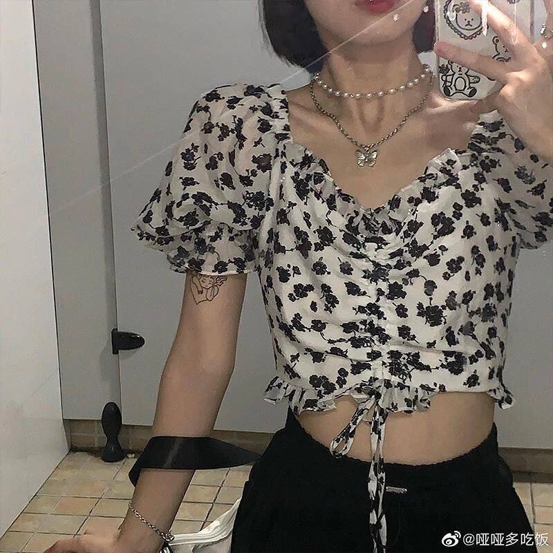 韩版网红夺命玫瑰 法式复古高腰设计感衬衫女泡泡袖短上衣2021夏热门设计联盟服务商