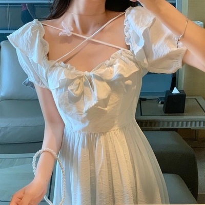 白色。新款2020系带长裙短袖夏季女仙连衣裙方领中复古女裙设计感热门设计联盟服务商